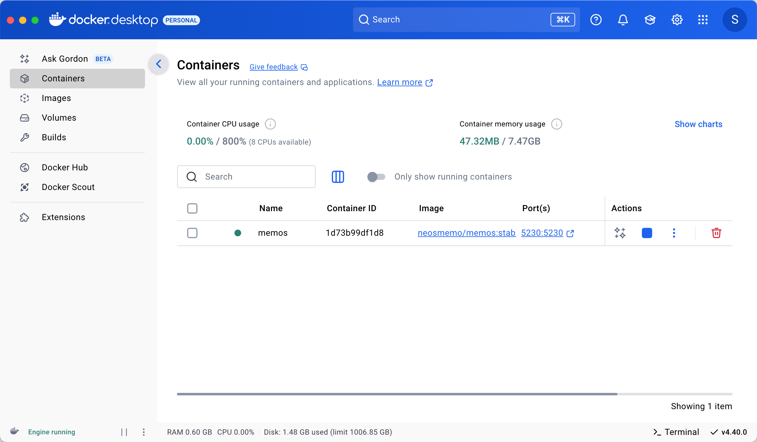 比如我们想运行一个开源的轻量级笔记系统 Memos,安装了 Docker 之后只需要一条命令: