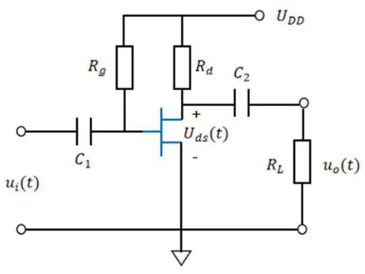 这个看似复杂的电路,其每个元件都有明确的职责: * 晶体管 (MOSFET): 核心有源器件,负责放大。 * \(R_g\) 和 \(R_d\) (偏置电阻): 它们共同组成了偏置网络。其核心任务是为晶体管建立一个稳定、合适的直流静态工作点(Q点)。\(R_g\)通常很大,以确保输入信号不会被“短路”,同时为栅极提供一个确定的直流电压。\(R_d\)则将电源电压\(U_{DD}\)降低,为漏极提供一个合适的静态电压。 * \(C_1\) (输入耦合电容): 它的作用是“隔直通交”。它允许我们想要放大的交流输入信号 \(u_i(t)\) 顺利通过并进入栅极,同时阻止前级电路的直流偏置影响到我们的晶体管,也防止晶体管的直流偏置“泄露”回前级。 * \(C_2\) (输出耦合电容): 作用完全相同。它允许被放大了的交流输出信号 \(u_o(t)\) 顺利通过并传递给负载 \(R_L\),同时阻止电源的高压直流 \(U_{DD}\) 直接“烧毁”负载。 * \(R_L\) (负载电阻): 代表放大器需要驱动的对象,例如天线、扬声器或其他电路级。