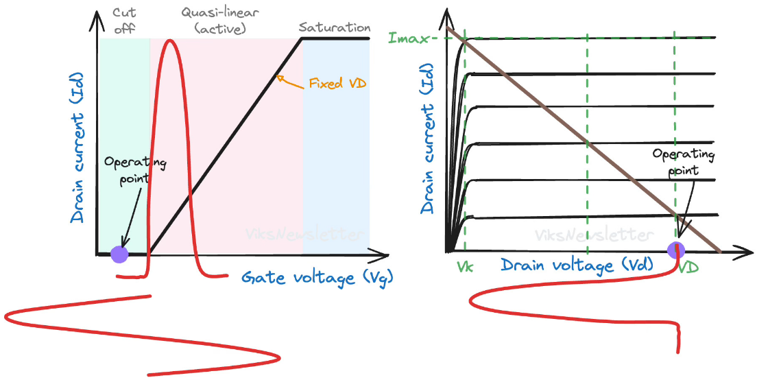 - 负载点 (Q点): 精确地设置在晶体管的截止点上 (\(V_{GSQ} = V_T\)) 。静态直流电流 \(I_{DQ}\) 几乎为零。
