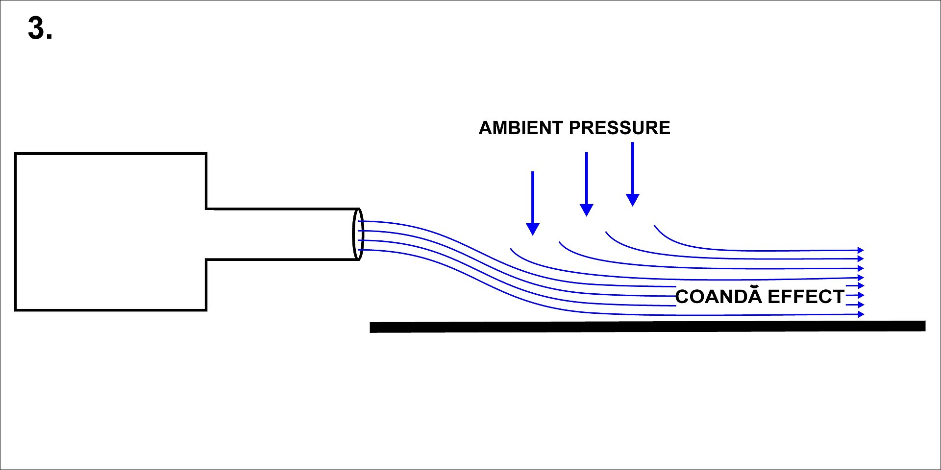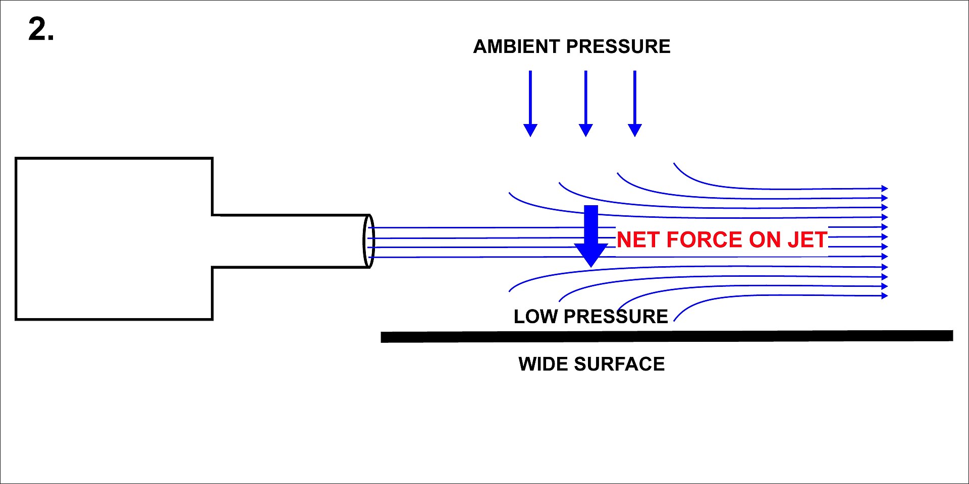 | 如果将一个(平坦的)表面紧贴并平行于射流放置,则从射流和表面之间被移除的空气分子无法轻易被周围空气分子补充。由此导致的射流和表面之间的空气不足,使得射流该侧的气压下降幅度大于另一侧。 | ![]() |