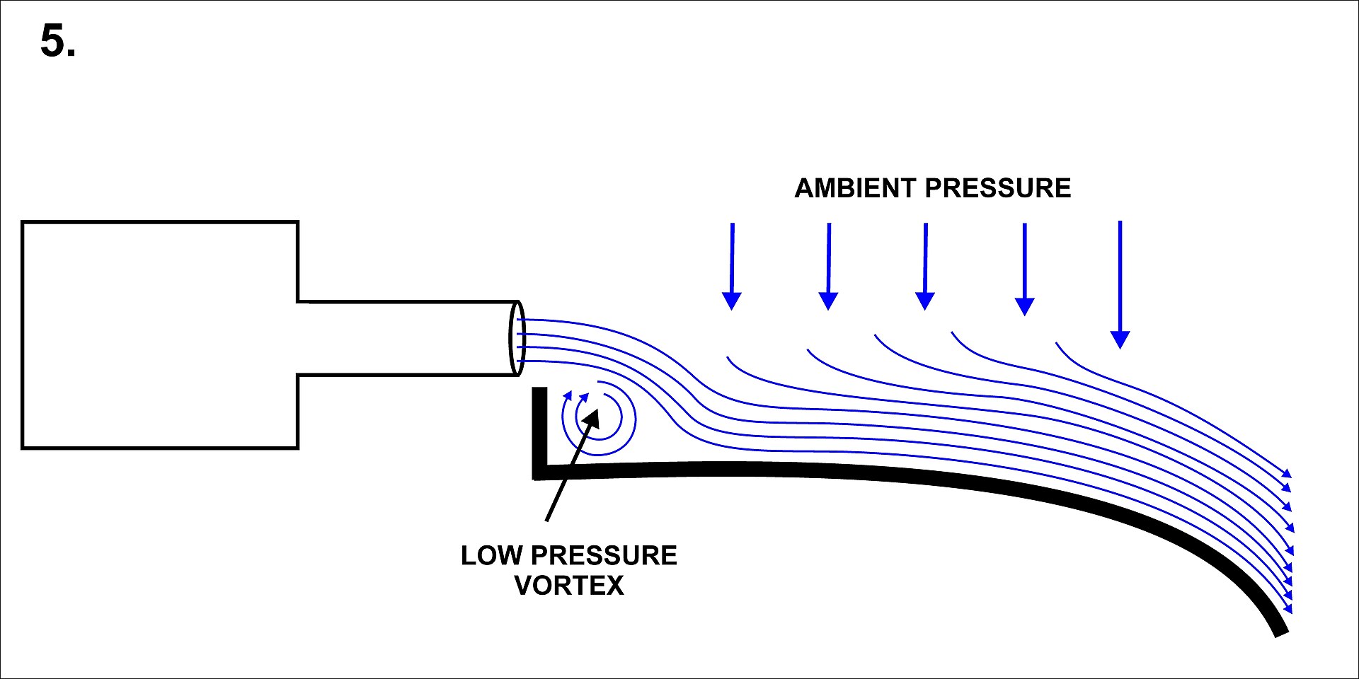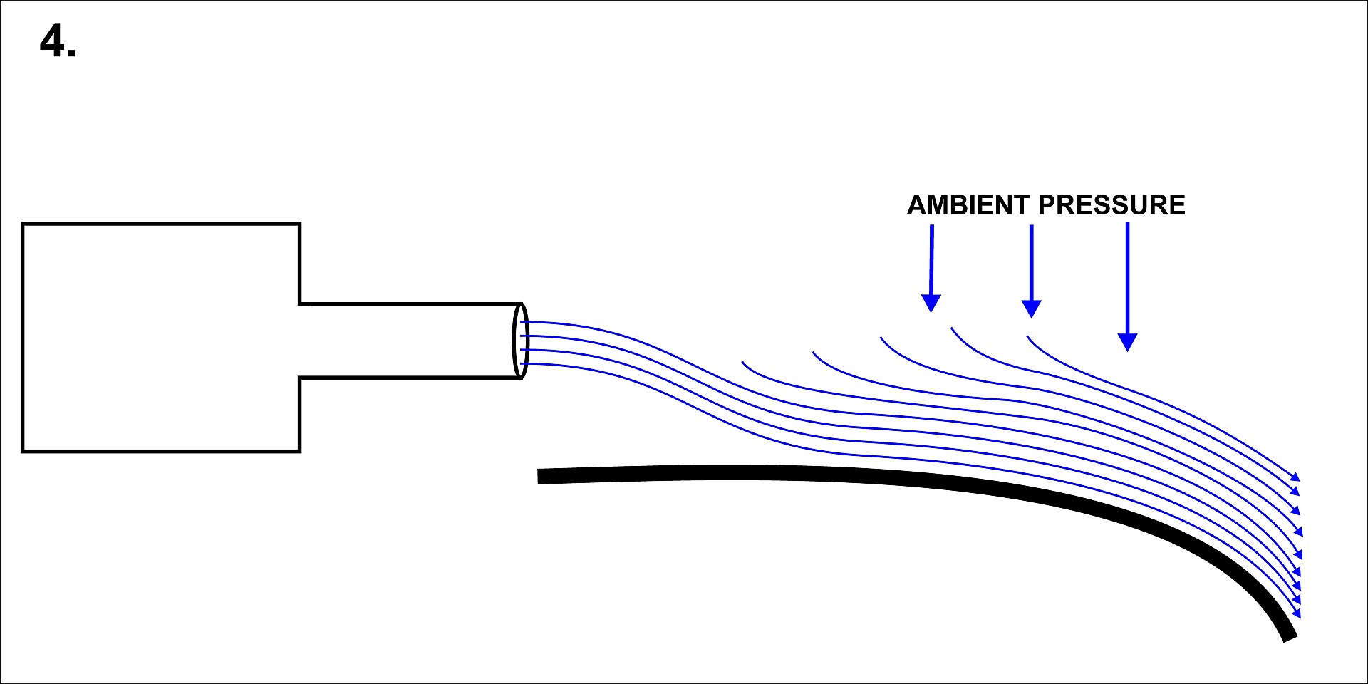 | 即使表面像图中所示是弯曲的,射流也会附着在该表面上,因为任何进入射流和表面之间空间的周围空气分子都会被射流卷吸而走。 | ![]() |