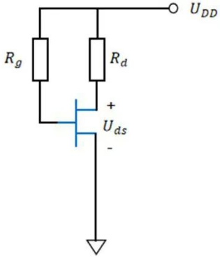 在漏极回路中,根据基尔霍夫电压定律(KVL),我们可以写出: \[ U_{DD} = I_d R_d + U_{ds} \] 整理后得到漏极电流 \(I_d\) 与漏源电压 \(U_{ds}\) 之间的关系: \[ I_d = -\frac{1}{R_d} U_{ds} + \frac{U_{DD}}{R_d} \] 这就是直流负载线方程。它描述了在这个电路中,所有可能的直流工作点(\(I_d\), \(U_{ds}\))的集合。在晶体管的输出特性图上,这是一条斜率为 \(-1/R_d\) 的直线。