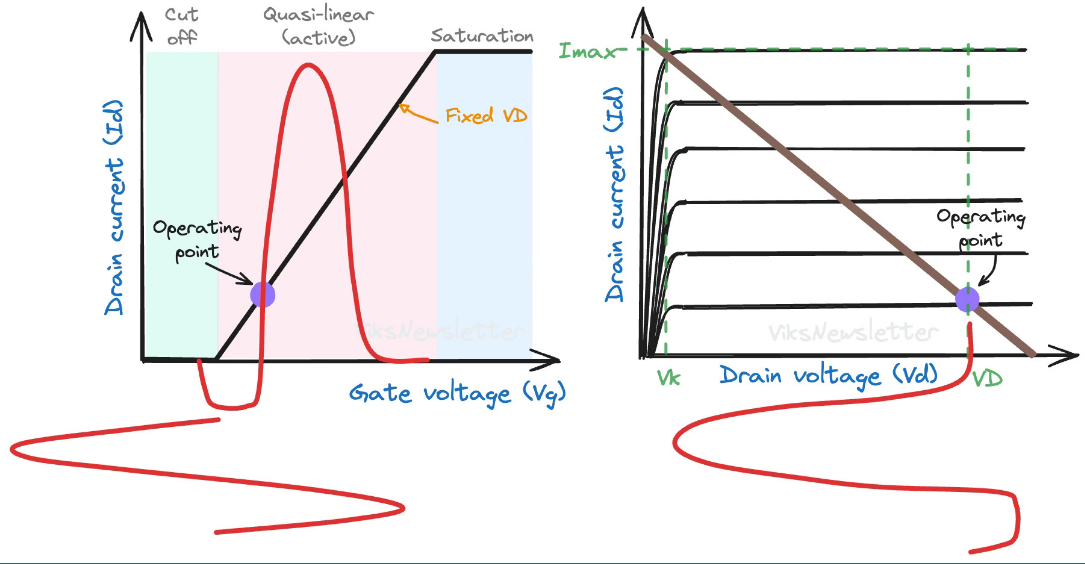 - 这条紫色的交流负载线,才是晶体管在实际放大信号时的“行动轨迹”。当输入信号使栅压在Q点上下摆动时,晶体管的(\(I_d\), \(U_{ds}\))点就会沿着这条交流负载线来回滑动。