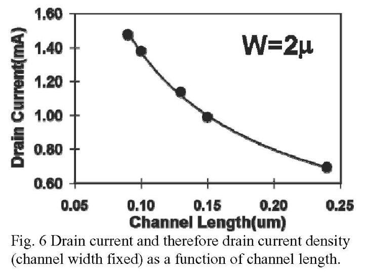 - 如果退化增强是由于漏极结“加热”引起的,那么它必须随着漏极电流密度的增加而增加。可以通过研究沟道长度依赖的退化来检查这种影响。在相同的栅极和漏极偏置下,较短的沟道长度会导致更高的漏极电流密度,如图 6 所示。图 7 显示了沟道长度相关的晶体管退化。为了节省测量时间,一些数据是在更频繁的测量中断和更短的总应力时间下收集的。由于 NBTI 退化具有松弛现象,这些数据往往具有更高的斜率。可以看出,零漏极偏压的数据基本与沟道长度无关,而方波漏极偏压的数据显示出明显的沟道长度效应。较短的沟道长度会导致更大的增强退化,完全符合加热解释的预期。(物理栅极长度比沟道长度标签小 40nm。)