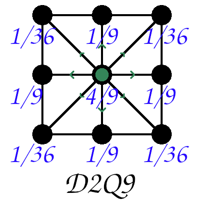 在D2Q9(2维9速度分量)格子玻尔兹曼中,空间中的每一个点都储存着9个速度分量,分别指向上下左右以及四个角点。这些速度分量就离散地代表了\(f(\boldsymbol{r}, \boldsymbol{p})\)在动量空间的分布。因此空间中的每一点原本需要计算在动量空间的积分, \[ \langle X(\boldsymbol{r})\rangle=\ \int X(\boldsymbol{r}, \boldsymbol{v}) f(\boldsymbol{r}, \boldsymbol{v}) \mathrm{~d} \boldsymbol{v} \] 现在就可以用求和代替了, \[ X(\boldsymbol{r}) = \sum_{i=1}^9 f(\boldsymbol{r}, \boldsymbol{v_i})X(\boldsymbol{r}, \boldsymbol{v_i}) = \sum_{i=1}^9 f_iX_i \] 实际上密度就是把分布函数的速度部分积分掉: \[ \rho(\boldsymbol{r}) = \sum_{i=1}^{9} f_i \] 动量可以表示为: \[ \rho(\boldsymbol{r})\boldsymbol{u}(\boldsymbol{r}) = \sum_{i=1}^{9} f_i \boldsymbol{v_i} \] 下图是D2Q9模型中空间中每一点的速度离散及其权重示意图,权重主要决定了后面平衡分布的计算,它肯定是可以推导的,不影响对方法本身的理解。